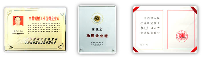 公司董事長(zhǎng)陳競(jìng)宏榮獲全國(guó)機(jī)械工業(yè)“優(yōu)秀企業(yè)家”;江蘇省“勞動(dòng)模范”、“創(chuàng)業(yè)之星”;泰州市“優(yōu)秀共產(chǎn)黨員”;靖江市“功勛企業(yè)家”等稱號(hào)。